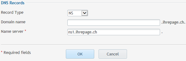 Klicken sie auf "Add DNS Record", wählen den Record Typ "NS" aus, geben dann alle benötigten Angaben dazu ein und speichern dies mit "OK" ab.