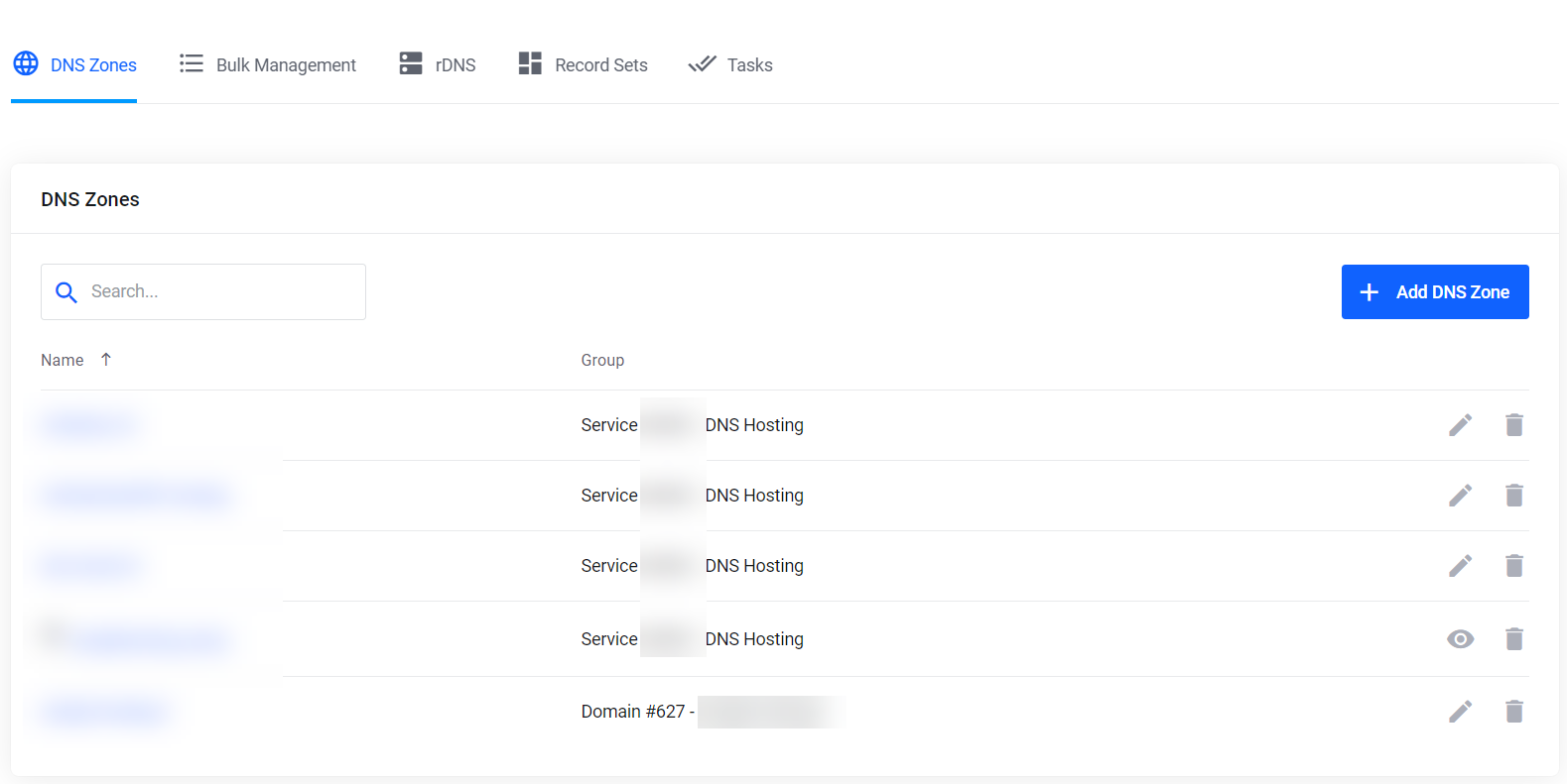 - Nun sehen sie eine Übersicht über alle ihre DNS Zonen. Dies können Domain sein die sie bei uns registriert haben, dann startet der Group Tag mit Domain und Service Nummer oder aber die DNS Zonen sind im DNS Hosting angelegt worden welche den Group Tag Server DNS Hosting bekommen.