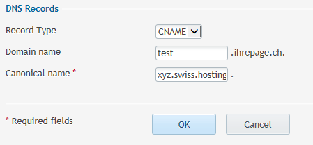 Klicken sie auf "Add DNS Record", wählen den Record Typ "CNAME" aus, geben dann alle benötigten Angaben ein und speichern dies mit "OK" ab.